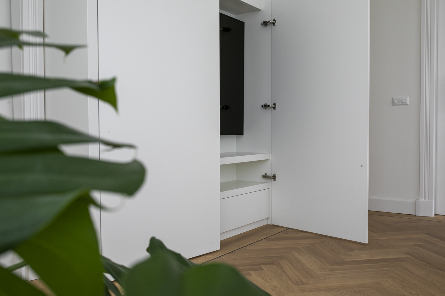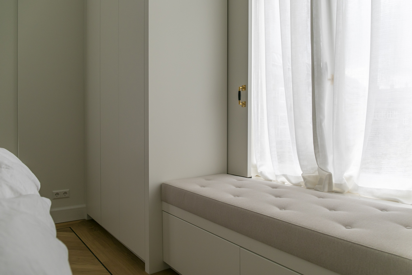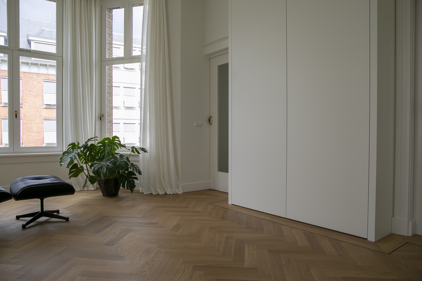 Voor dit appartement realiseerden we een volledig maatwerkinterieur: een stijlvol tv-meubel, elegante en suite deuren, strakke wandkasten en op maat gemaakte kasten en bankjes in de slaapkamers.