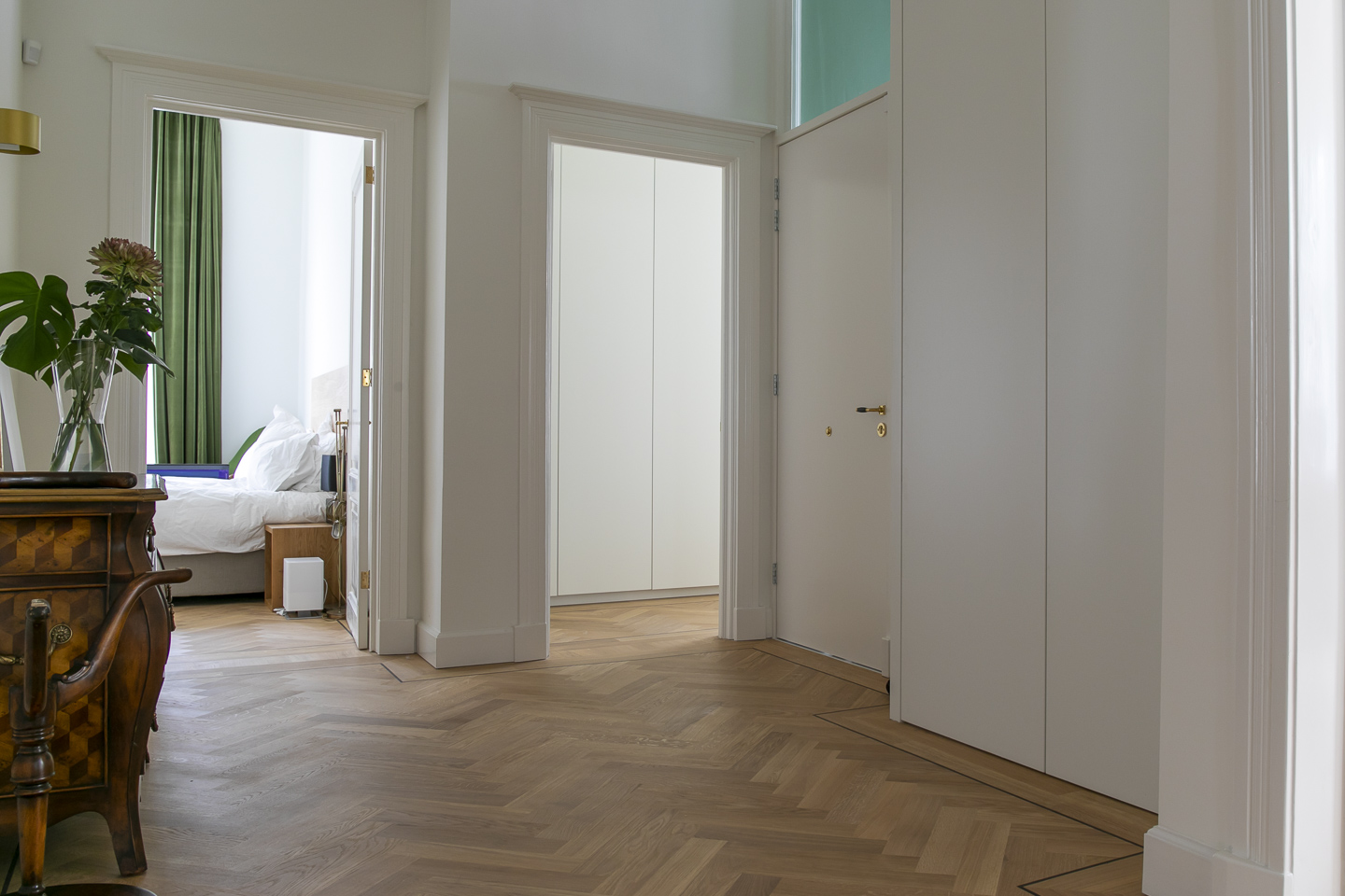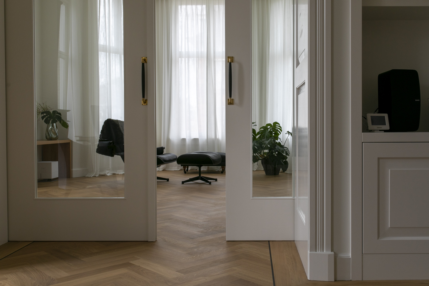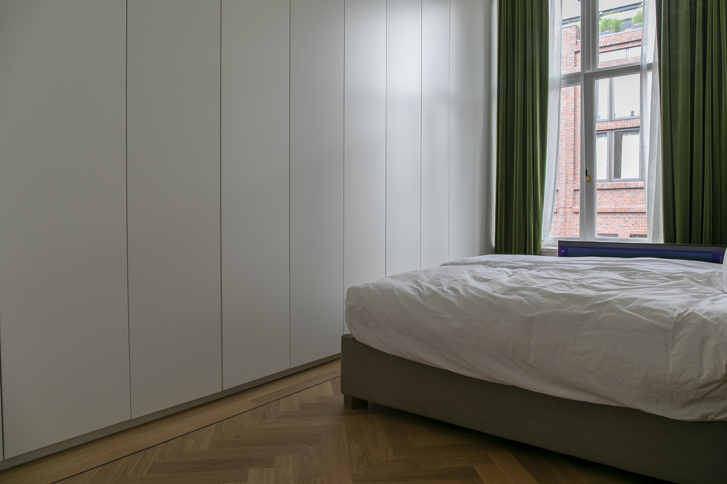 Voor dit appartement realiseerden we een volledig maatwerkinterieur: een stijlvol tv-meubel, elegante en suite deuren, strakke wandkasten en op maat gemaakte kasten en bankjes in de slaapkamers.