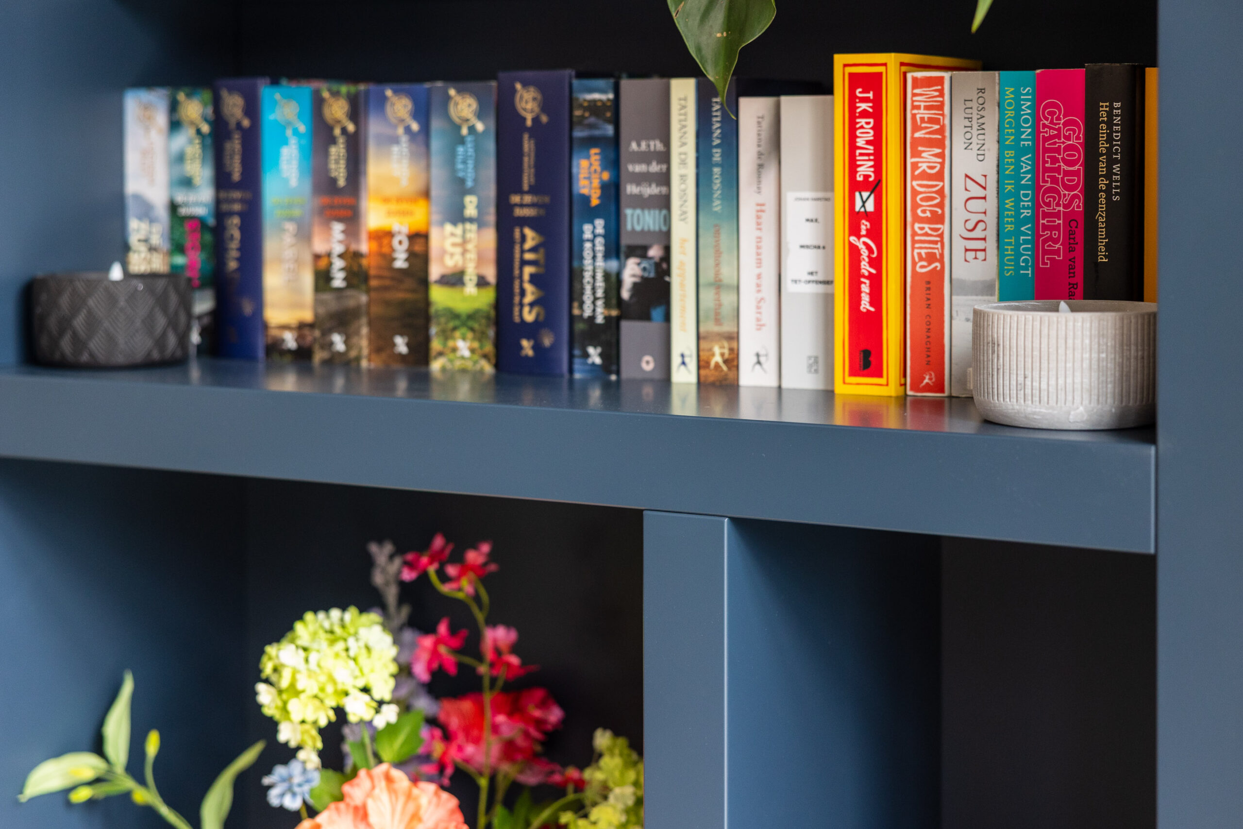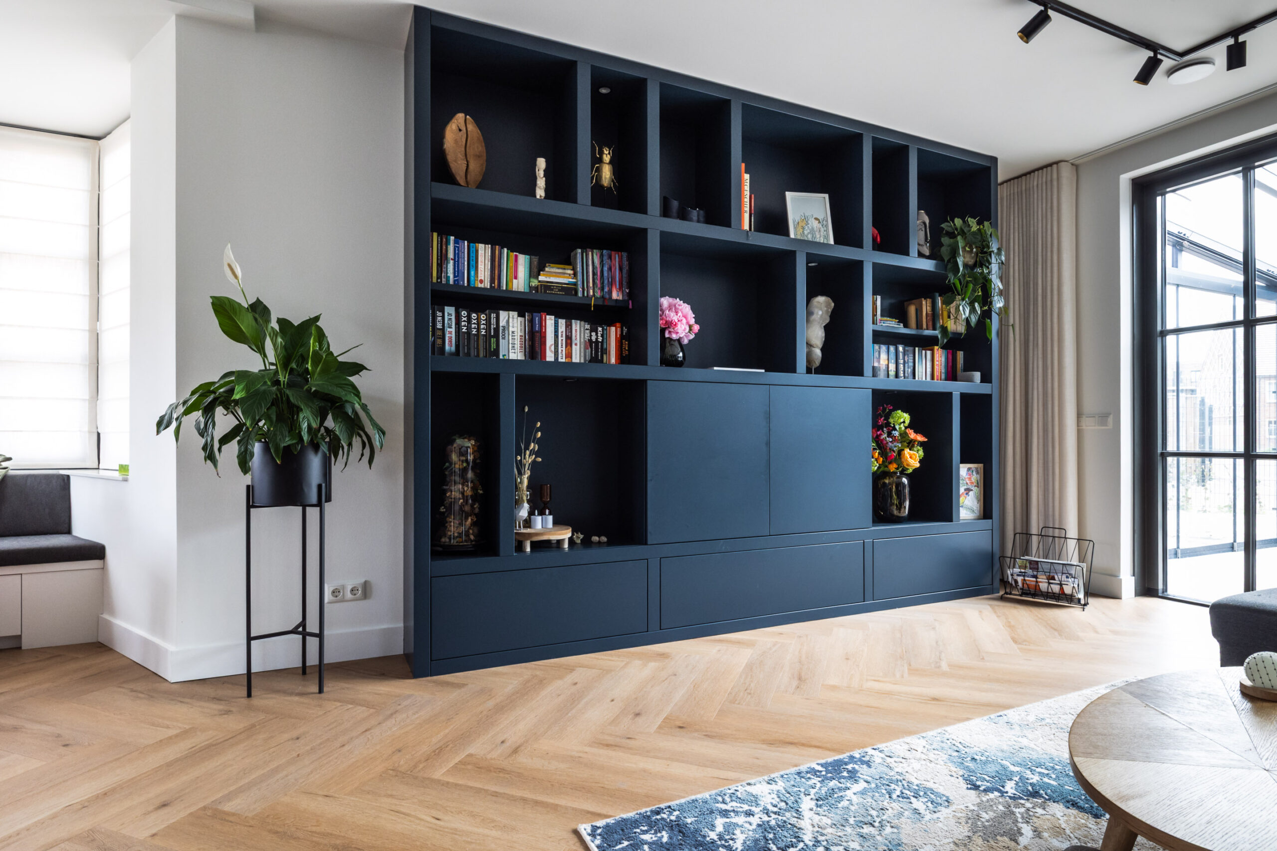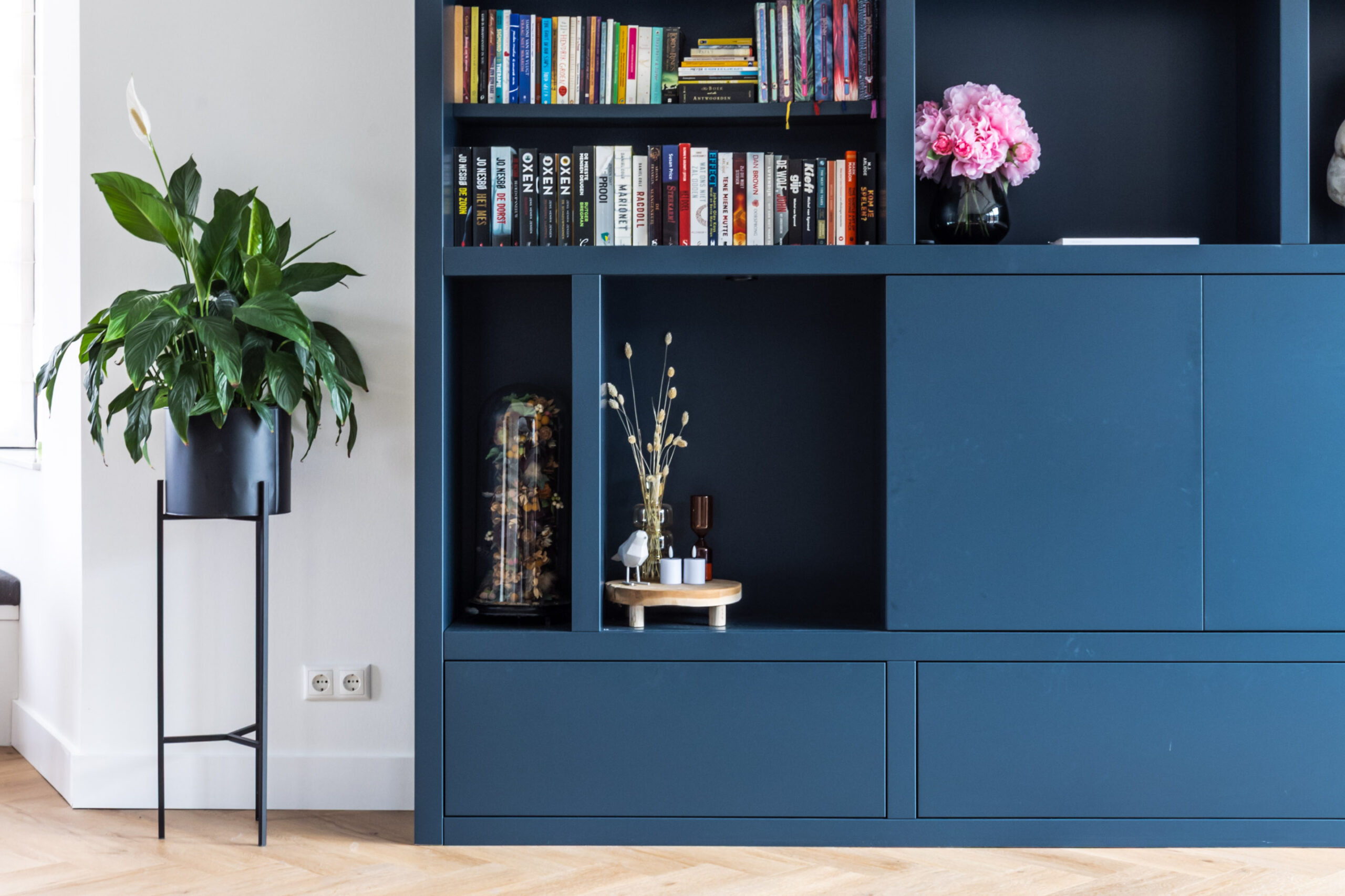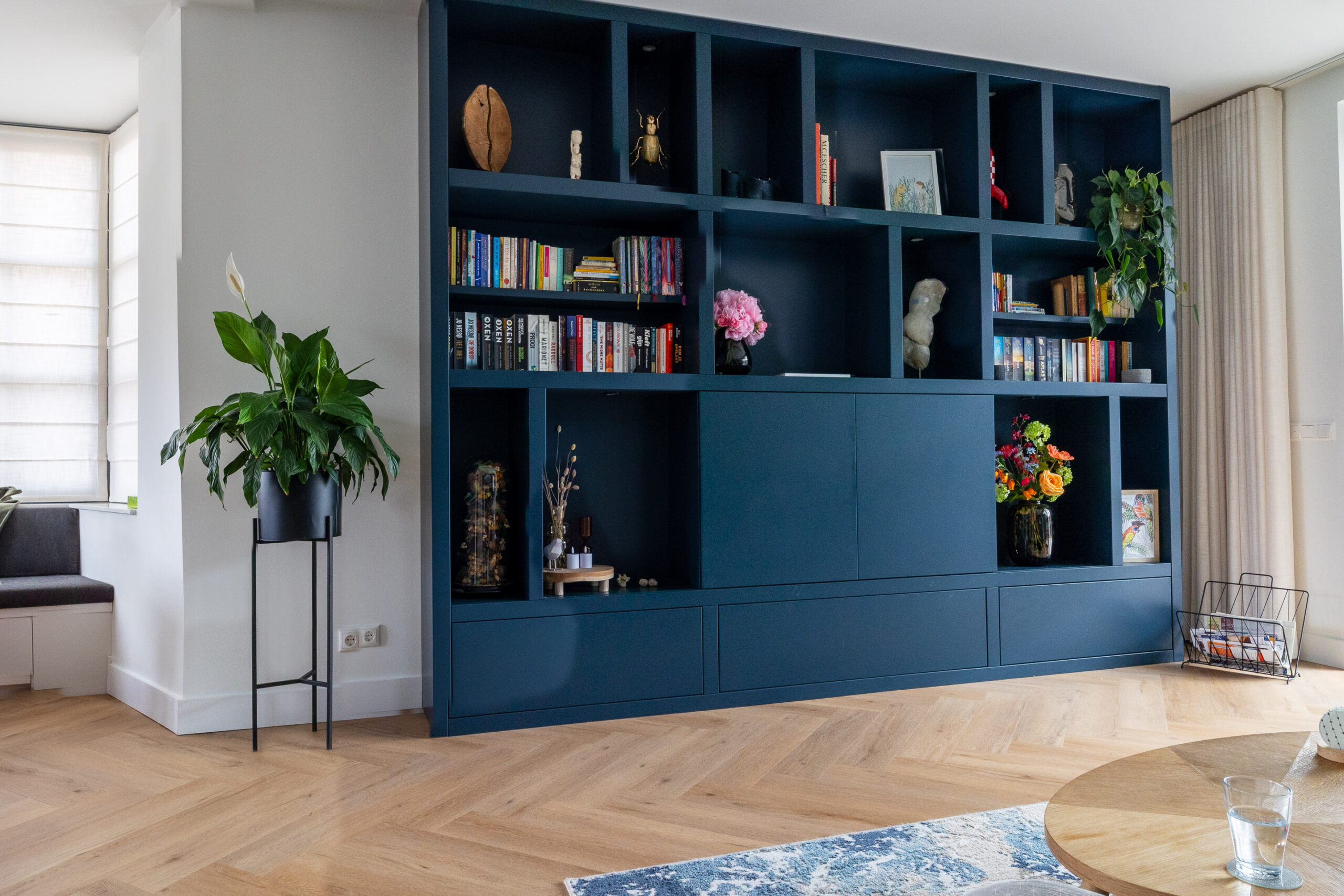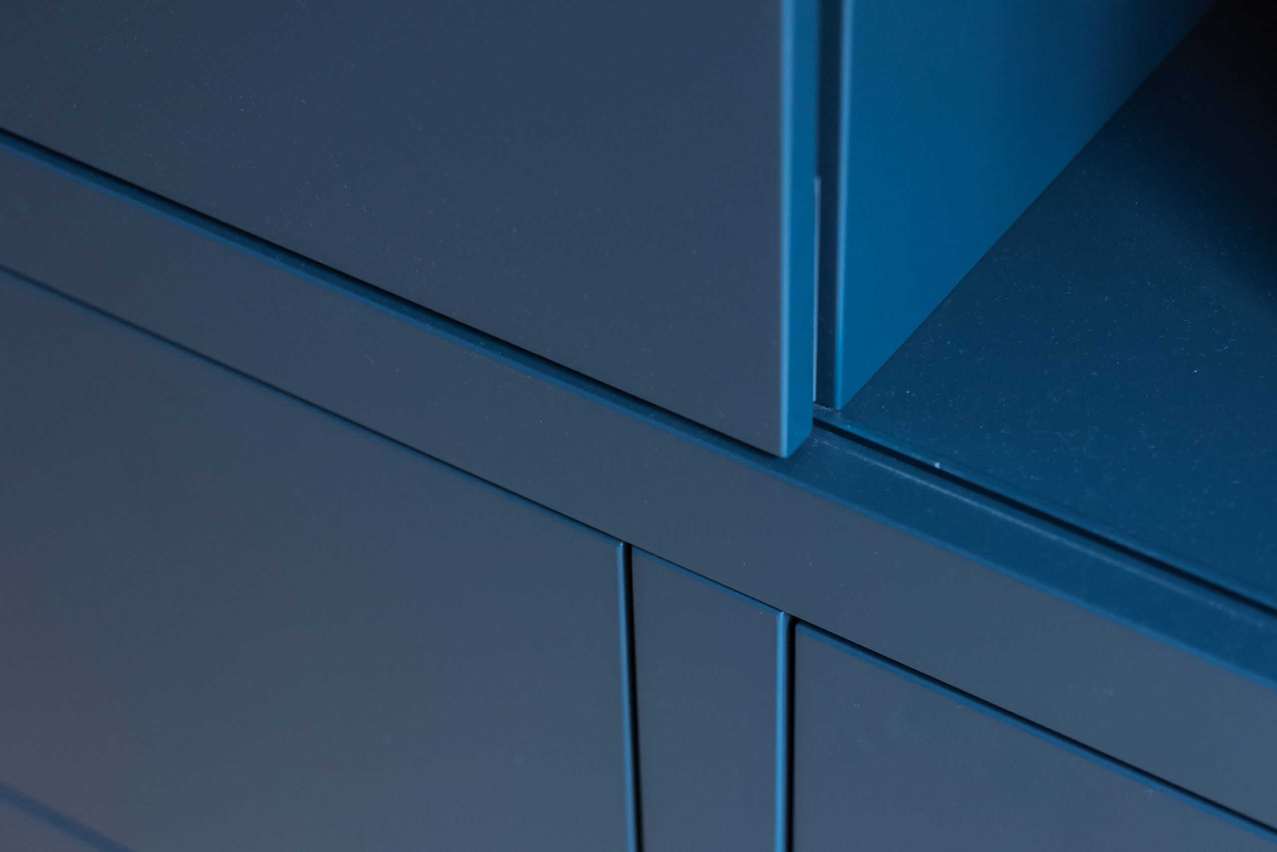 Met veel open vakken voor opbergruimte en een strakke, diep donkerblauwe afwerking. Twee deuren zorgen ervoor dat je de tv netjes kunt verbergen, met soft-close mechanisme voor extra gemak. Functioneel en stijlvol in één.