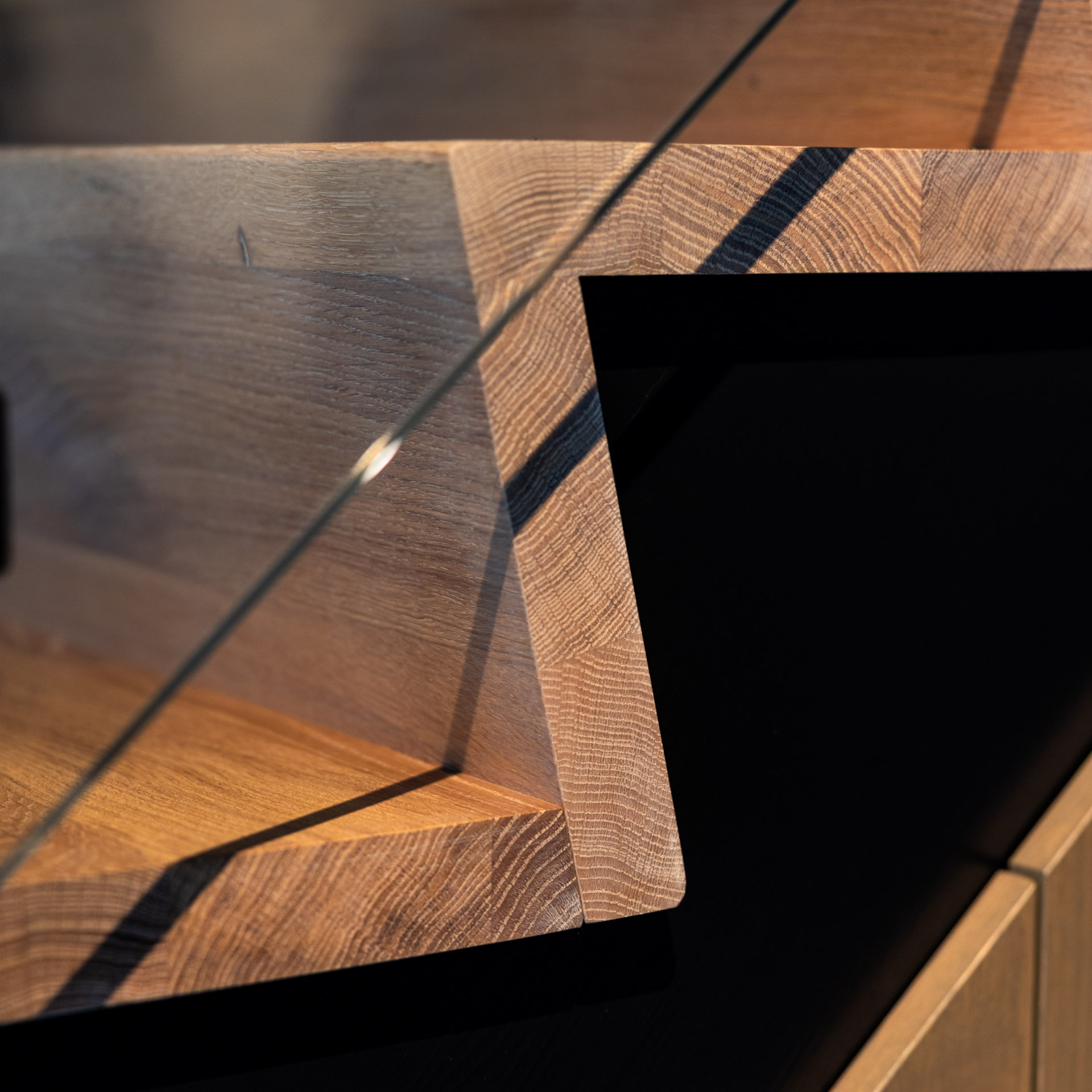 Het eikenhout geeft een warme, natuurlijke uitstraling, terwijl het staal en glas zorgen voor een moderne look. De push-to-open laden maken het geheel extra praktisch met veel, goed bereikbare opbergruimte.