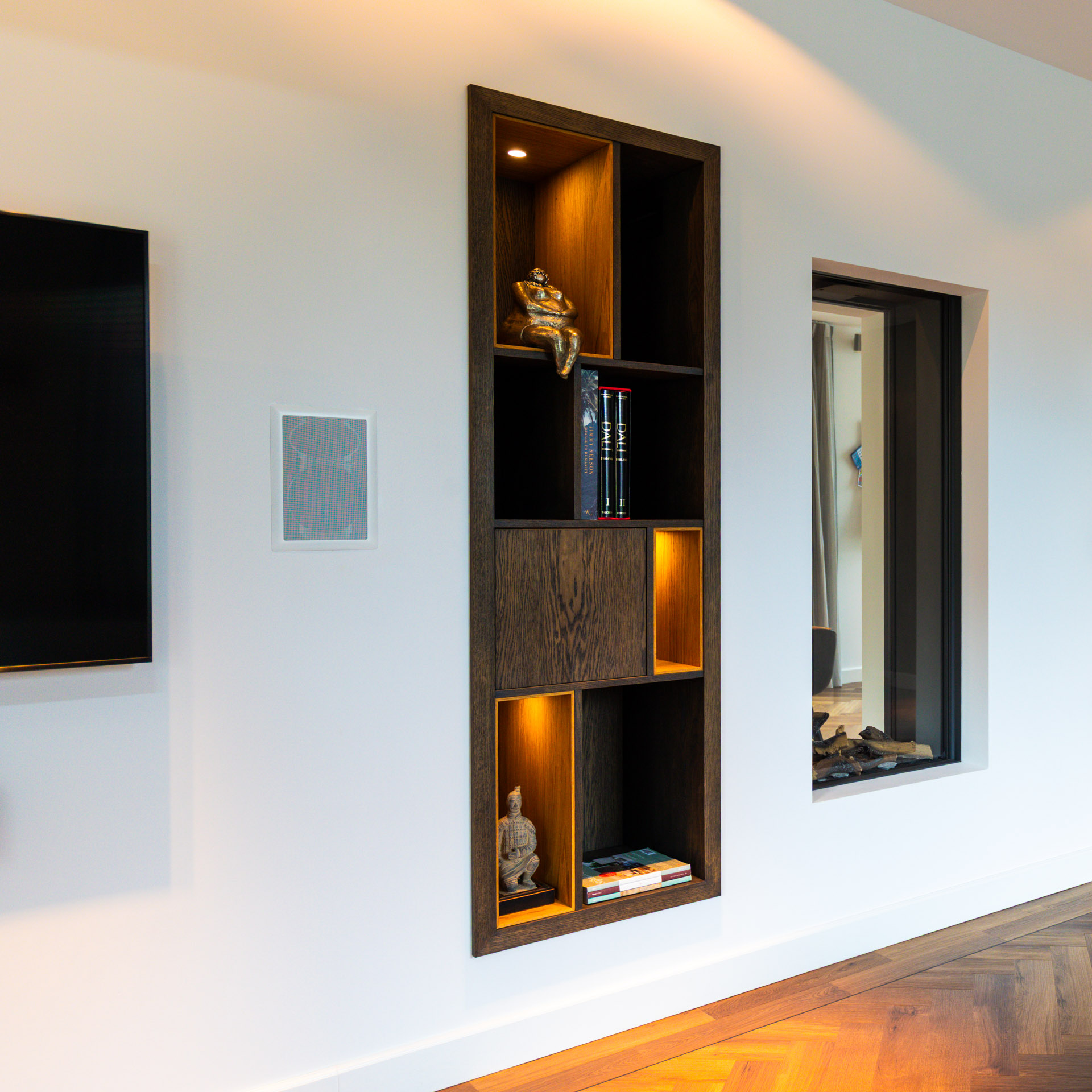 Deze woning scheidt de eetkamer op een unieke manier met kleurrijke kast die de nis in de muur opvult. Met de speelse indeling en verlichting voegen ze karakter toe aan de ruimte. En dankzij de push-to-open deuren zijn ze niet alleen stijlvol, maar ook praktisch als opbergruimte.