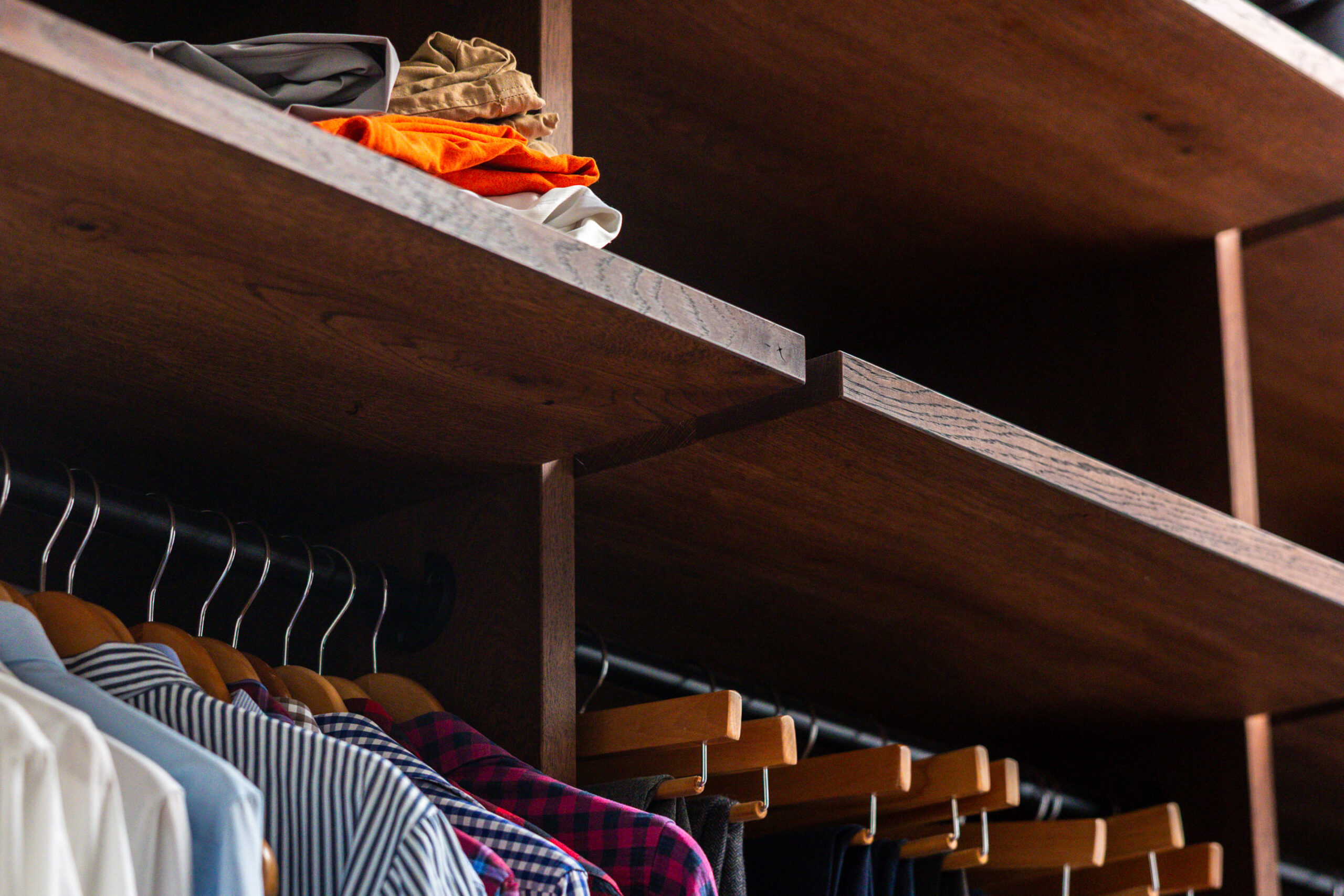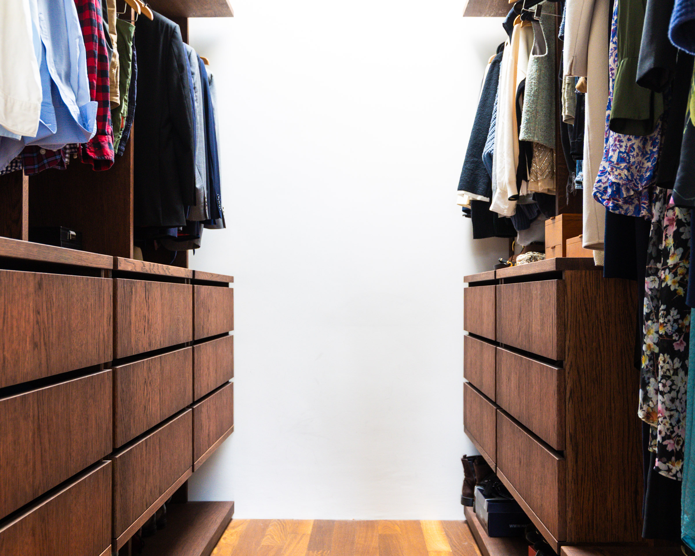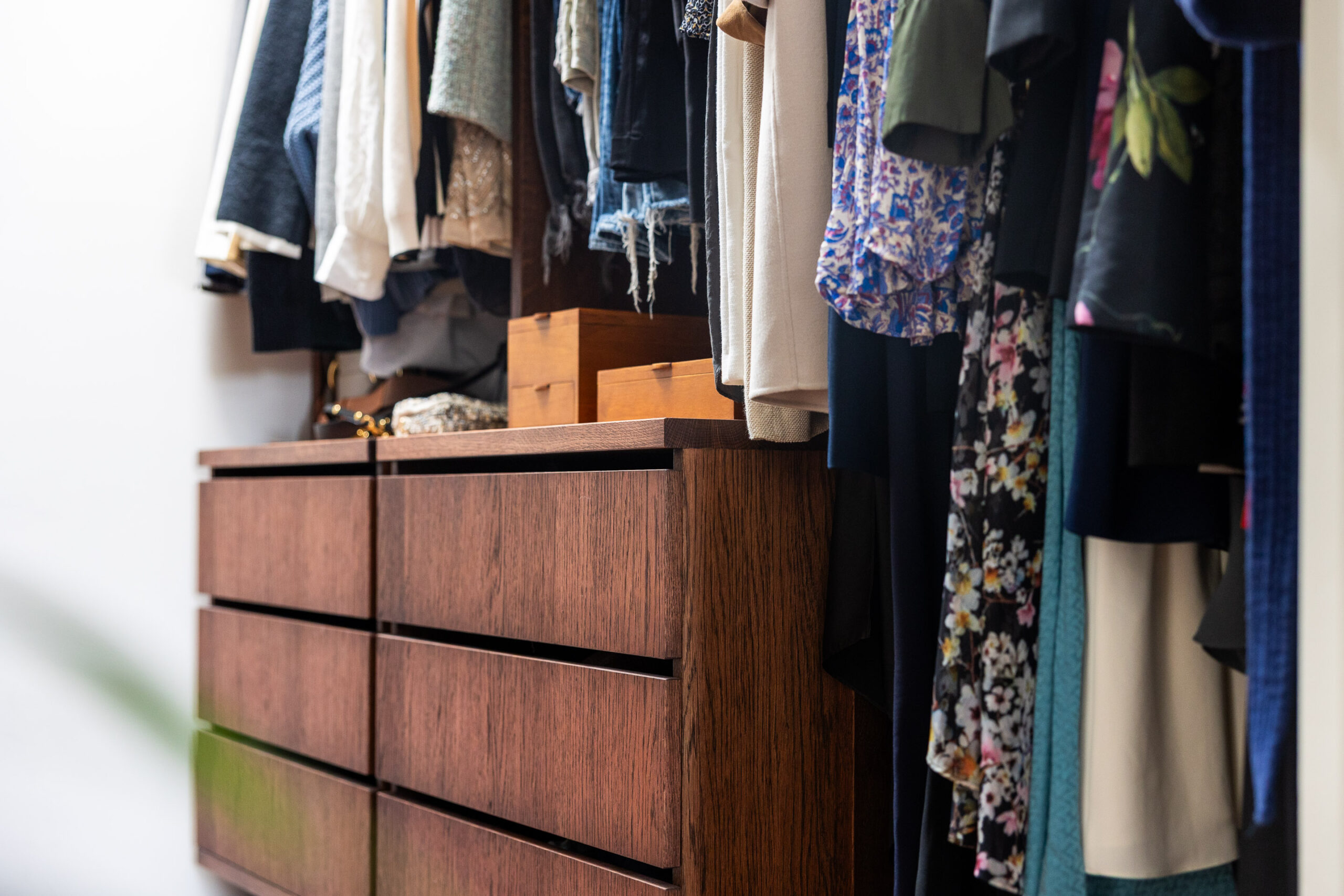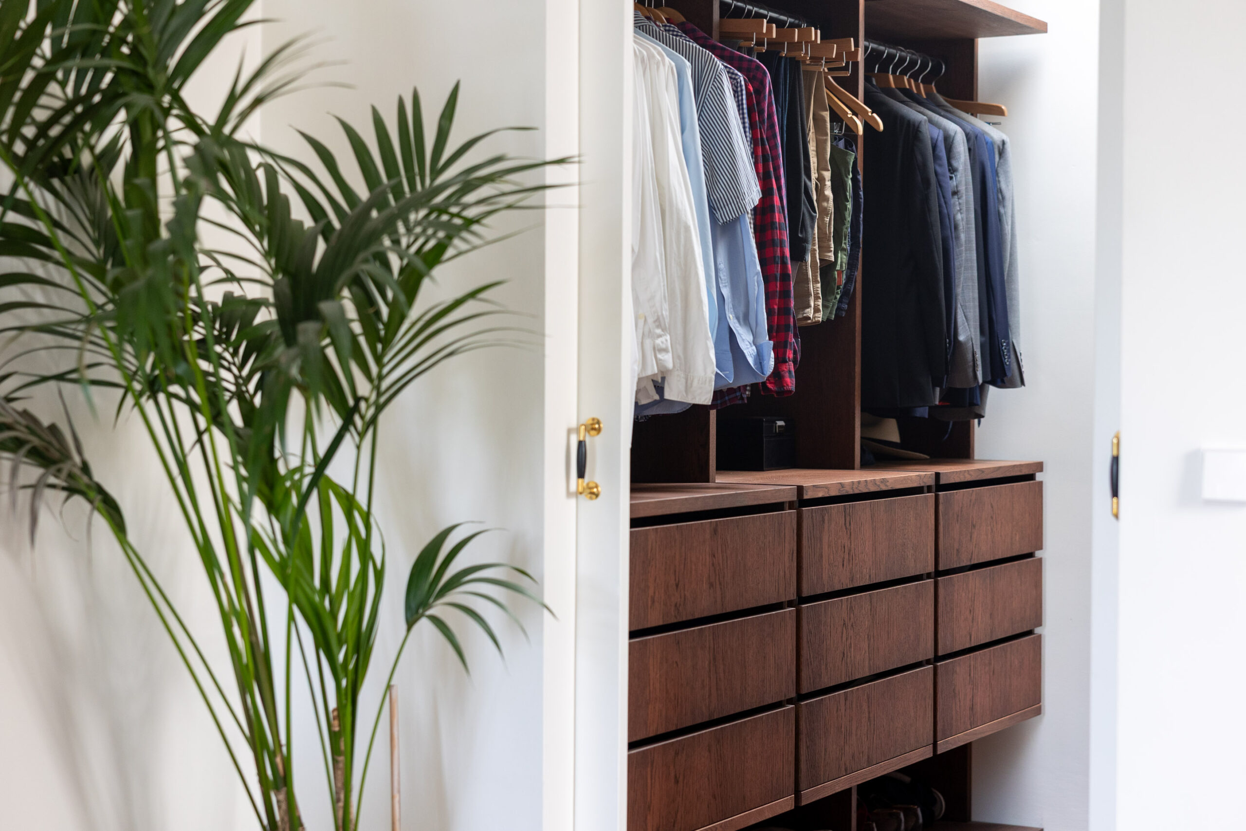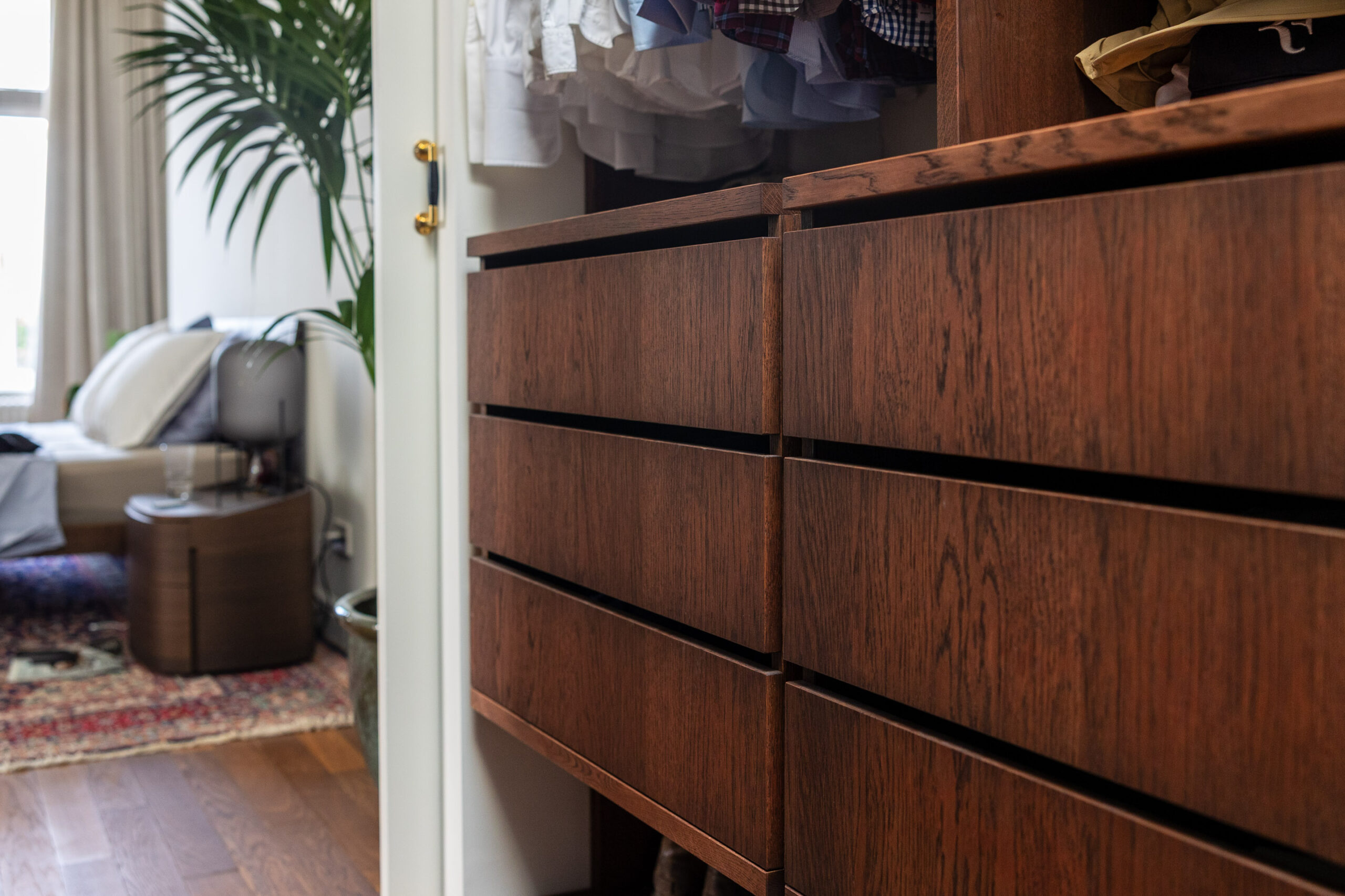 Deze prachtige op maat gemaakte inbouwkast, vervaardigd uit een combinatie van massief eikenhout en eiken gefineerd plaatmateriaal, past perfect bij de charme en uitstraling van het Amsterdamse appartement waarin hij is gemaakt. De achttien ruime lades zijn voorzien van subtiele greeplijsten en een soft close systeem. De zwarte kledingroedes geven een chique, klassieke touch aan het geheel. De kast is verdeeld in een mannen- en vrouwenafdeling, elk met een eigen ruimte en afgewerkt met een diepe, donkere olie, waardoor hij echt tot leven komt. De inloopkastruimte wordt afgesloten door twee bijpassende schuifdeuren, wat zorgt voor een harmonieuze en praktische indeling.