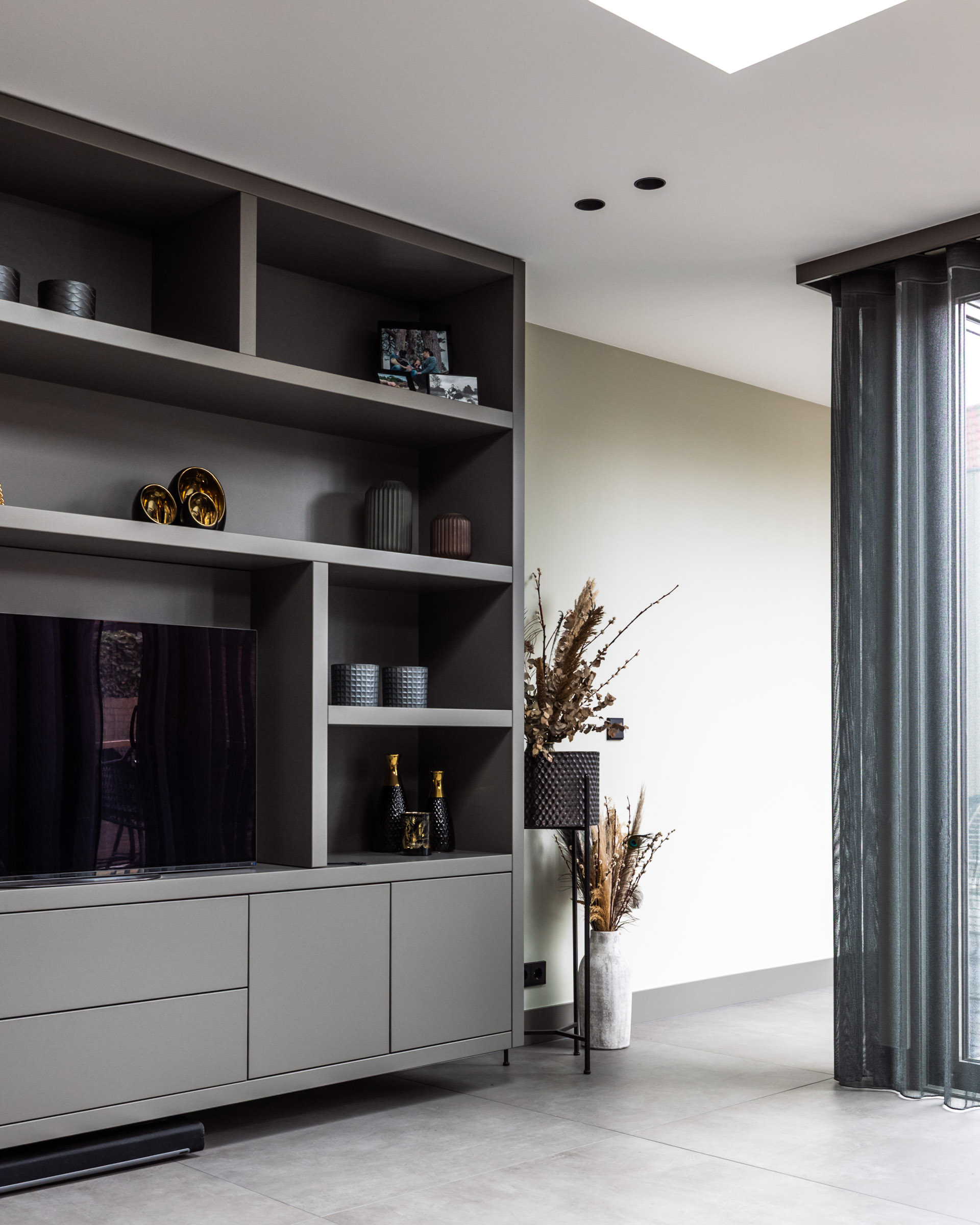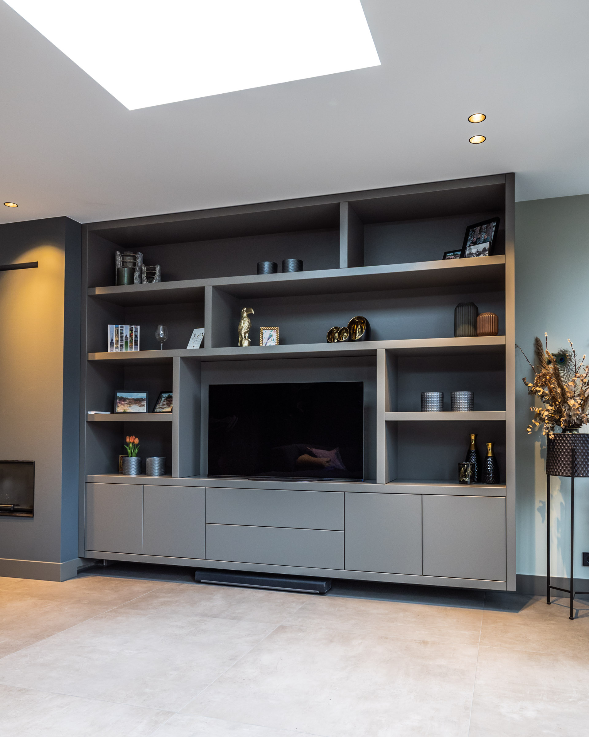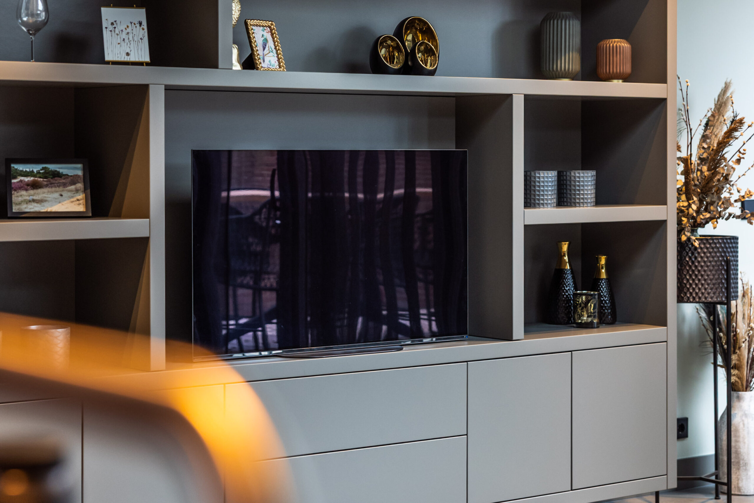 In Vinkeveen hebben we dit prachtige op maat gemaakte tv-meubel gerealiseerd. Het biedt ruimte voor de tv, apparatuur, accessoires en er is voldoende opbergruimte. Kortom een slimme en stijlvolle oplossing voor de woonkamer. Het meubel is afgewerkt in matte lak, waardoor het een strakke uitstraling heeft en perfect past in dit interieur.