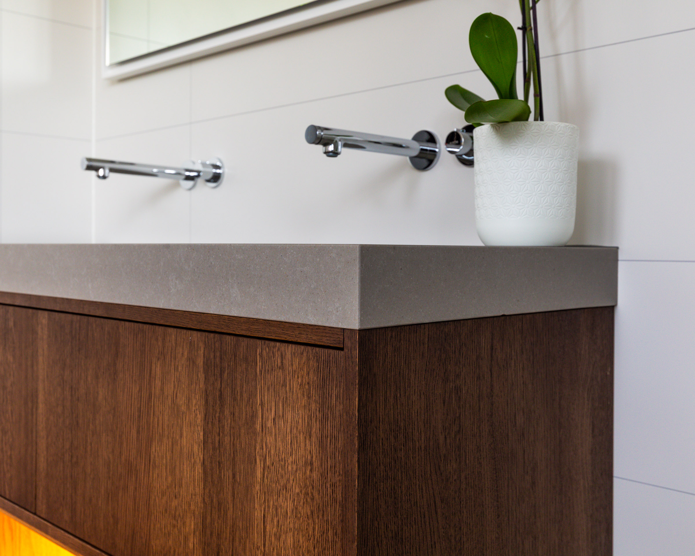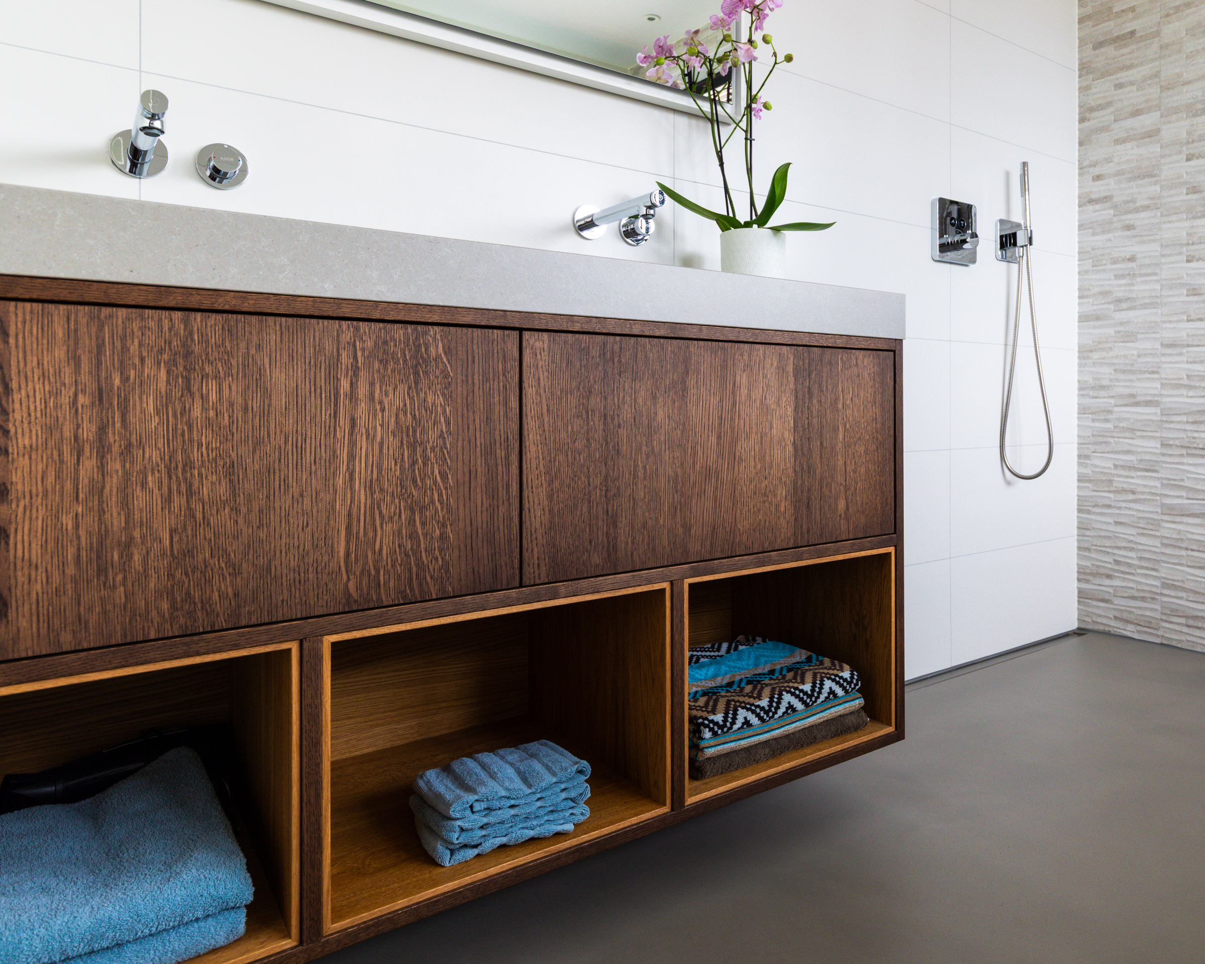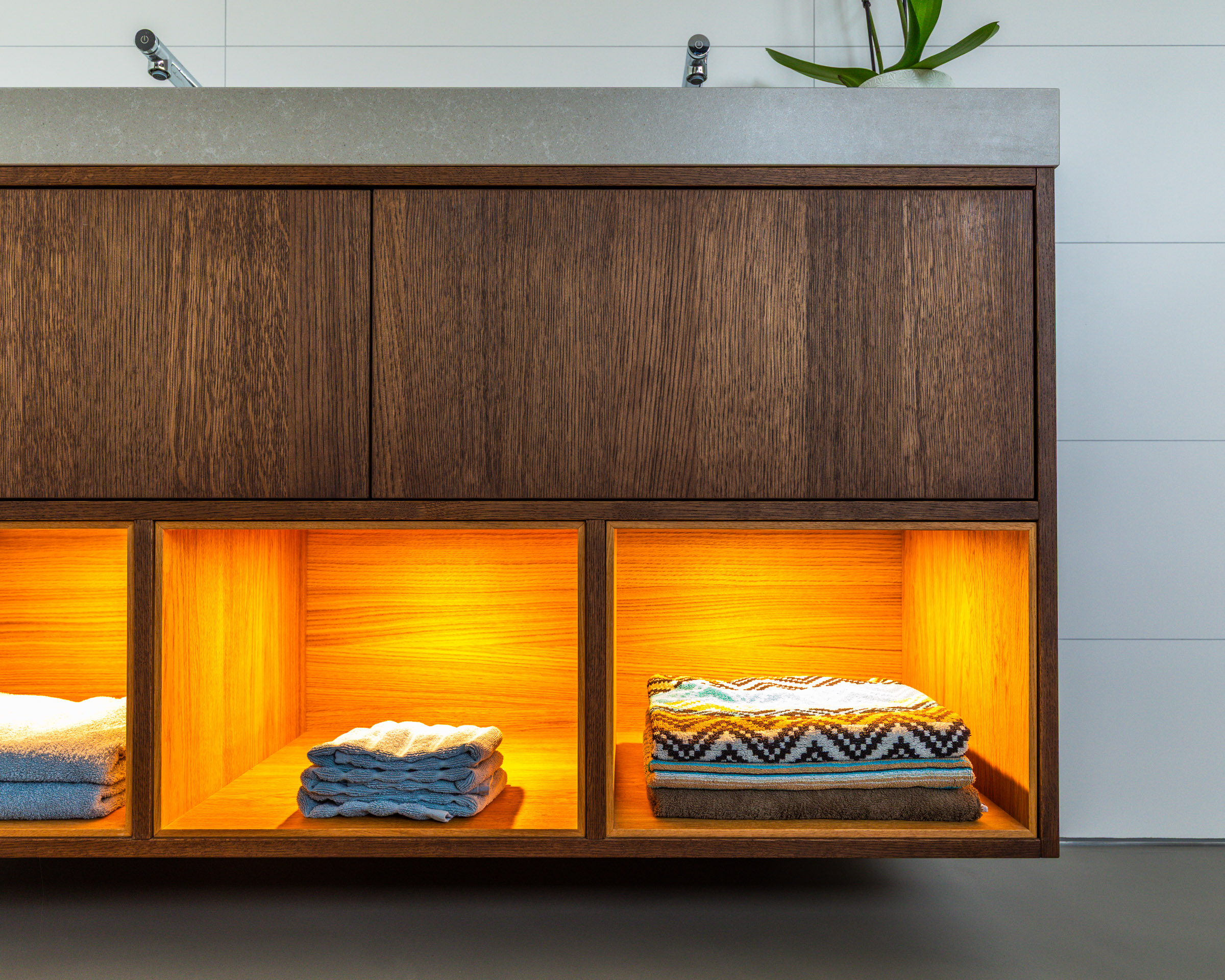 Een composiet blad met geïntegreerde waskommen rust op een stevig eiken meubel, uitgerust met ruime push-to-open lades en handige handdoekvakken inclusief verlichting.